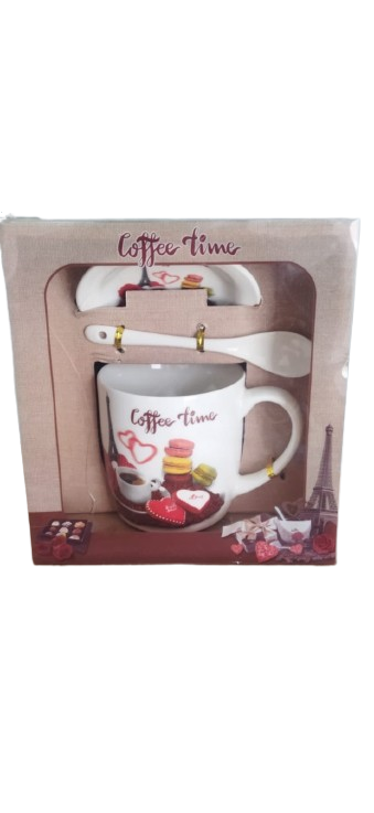 Pack de taza, cuchara y platito con diferentes diseños, ideal para regalar.